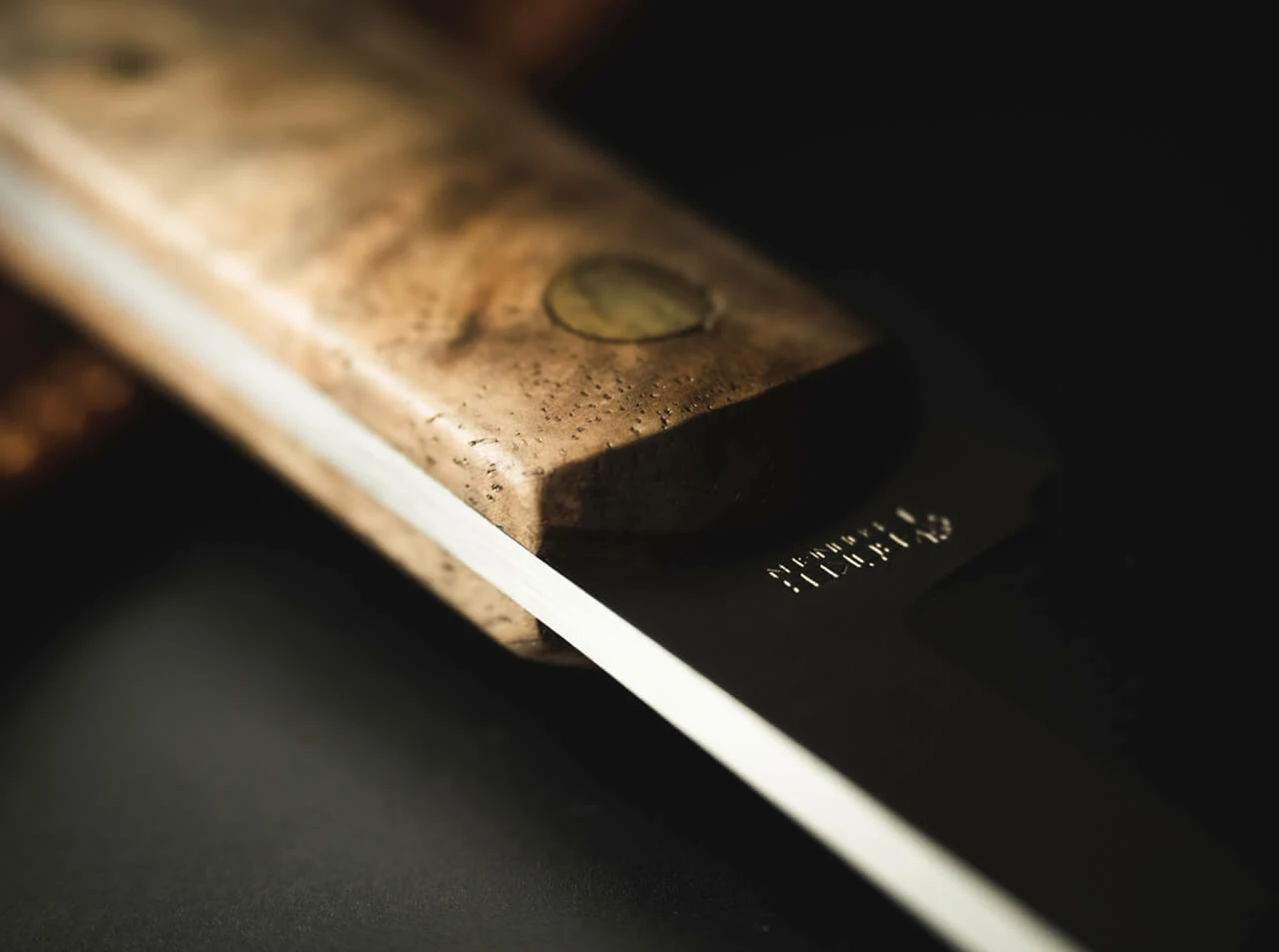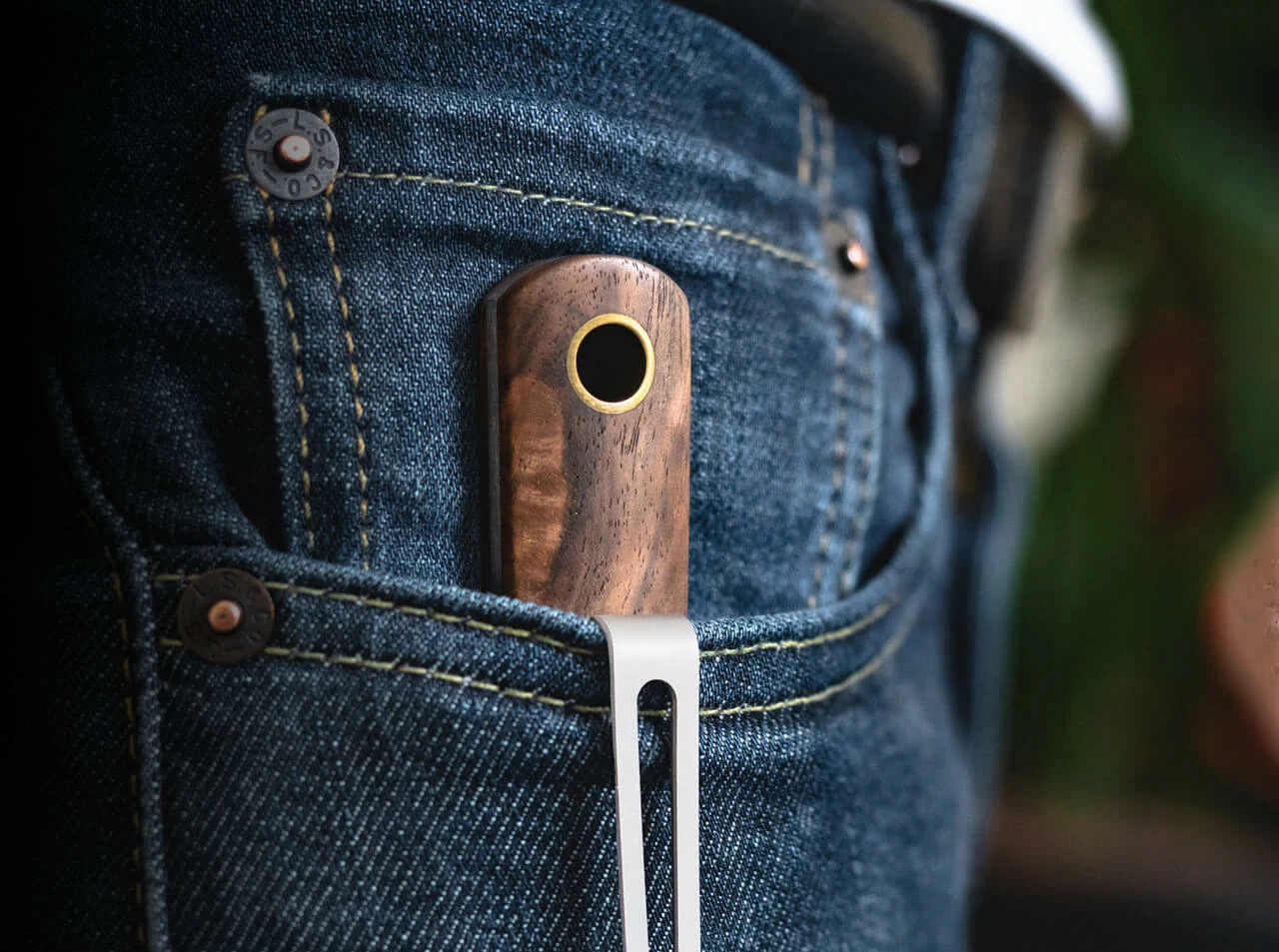 The handle of the BFF is so universally shaped that both small and somewhat larger hands can easily find room here. Only if you have exceptionally large paws, it could possibly be tight here. The walnut wood gives a great visual contrast to the brass pins. If you want to attach a bead, you can do so thanks to the large hollow rivet at the end of the handle.
