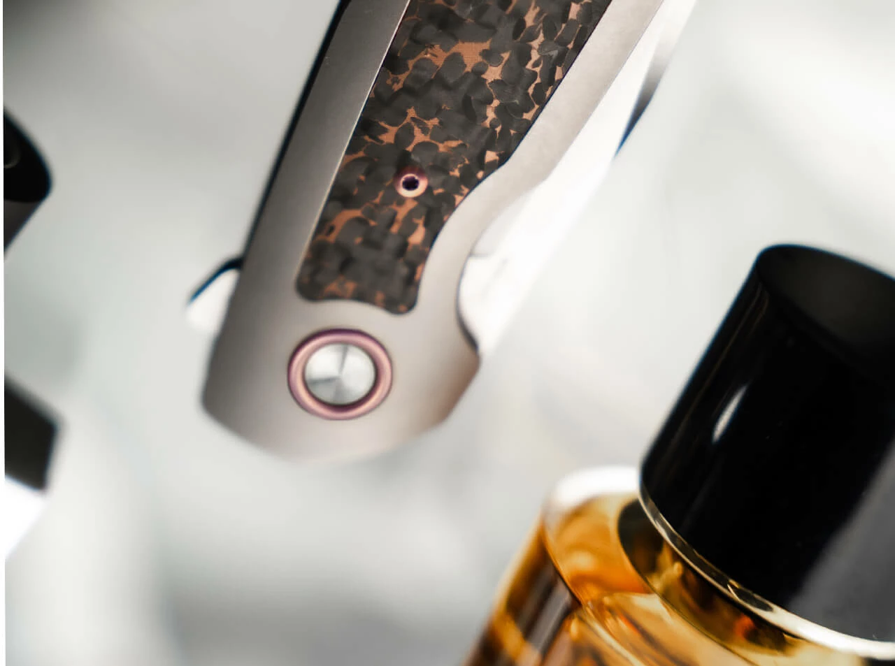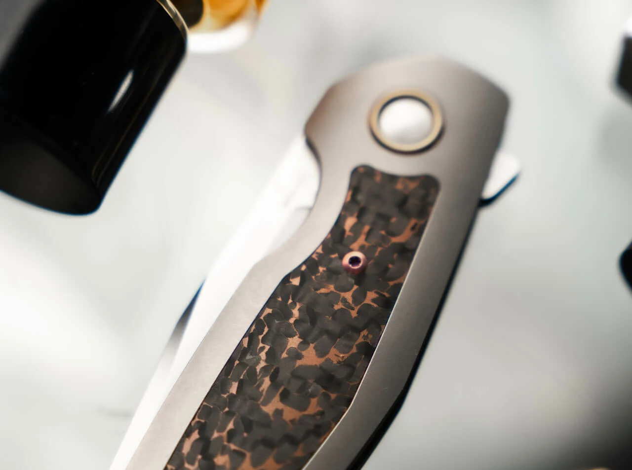 - handle with modern inlay of wild carbon fiber from FAT Carbon Materials & copper colored inclusions