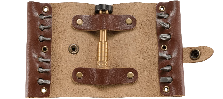 But can’t good tools also look cool? And what if you want to take your screwdriver set with you? CRKT designer Joe WU offers a great solution with the Hex Bit Tool Roll made of leather. In addition to 13 hex bits (each of which is in a small pocket in the leather), it includes a bit driver milled from solid brass, which not only has a great hand position, but also looks insanely good. The ball bearings embedded in the hand part ensure a buttery smooth operation, which will also provide you with a lot of fun. The Bit Driver is secured in the bag by two sturdy, riveted leather loops, so that nothing can get lost during transport.