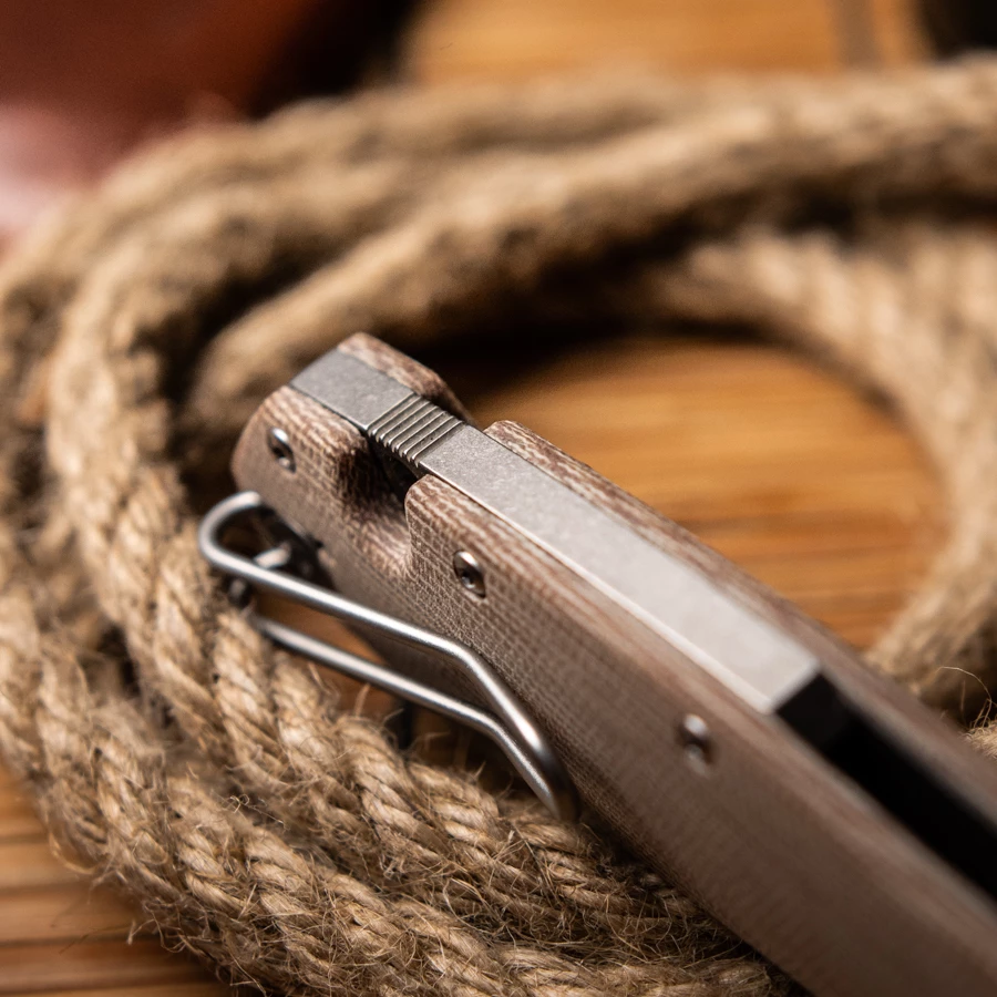 Although there is a clear optical reference to the Biblio, this is by no means an enlarged version of the GiantMouse classic. The Micarta handle scales have a great satin finish and have a slightly clearer, more angular line than the Biblio. The practical deep carry clip has of course remained, which makes the knife disappear discreetly in your pocket despite its overall length of 20cm. Unlike the GM5, the Grand is equipped with a solid liner lock, which locks the knife bombproof. Additional stability is provided by a massive milled backspacer made of titanium.