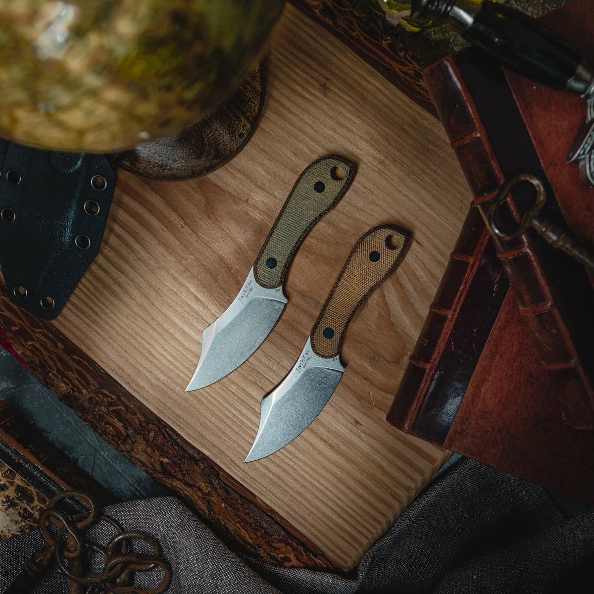The solid 14C28N steel blade has a curved edge, so that you still get a quite long cutting edge despite the short length. Thanks to the design of the back of the blade and the implied “horn” towards the clip point, your thumb will find plenty of room to apply force to the edge. The screw-on handle scales made of Micarta complete the picture wonderfully. The handle is designed so that the Jacktar is designed as a three-finger knife, but still offers a secure hand position. The scope of delivery includes a Kydex sheath that snaps firmly into place.