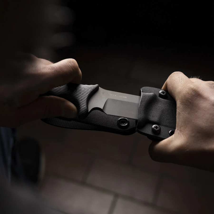 he Difensa comes with an initially very tight ( = secure) Kydex sheath. This is intentional: the knife should sit absolutely tight and secure so that there is no play even over a long period of use. Simply carry and use the knife a few times – the Kydex loosens a little, but still remains tight enough.| Blade Material: | CPM S45VN |