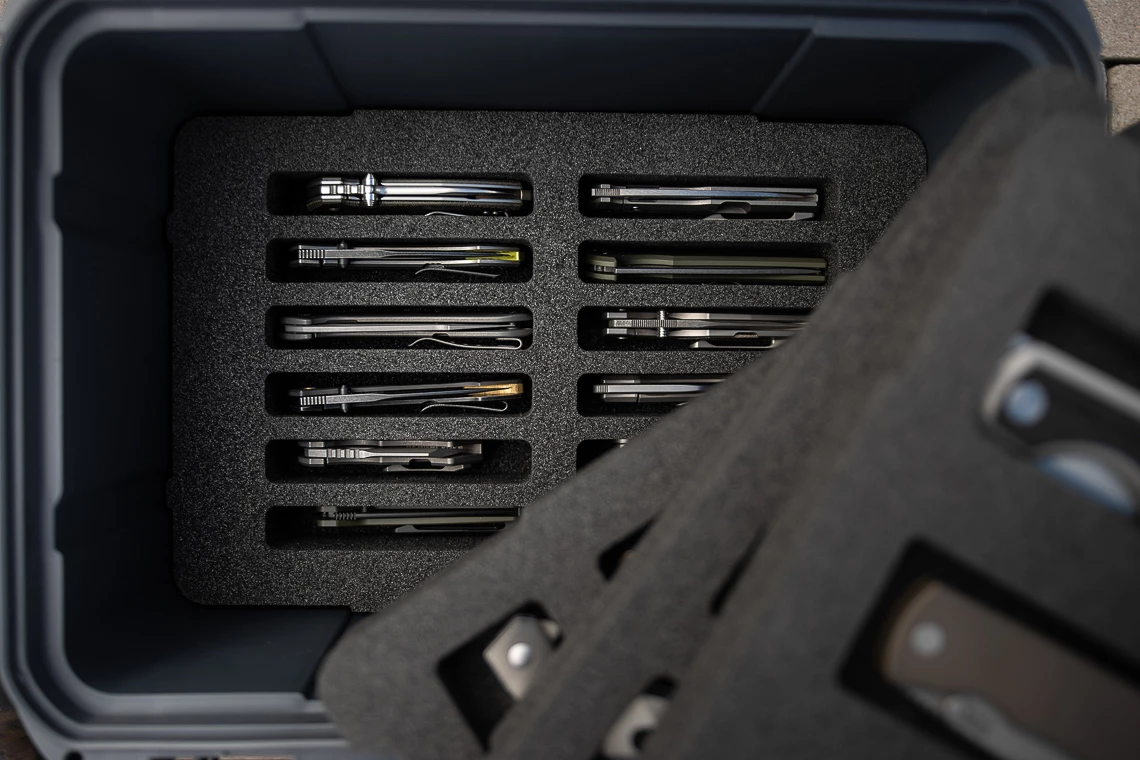 2 presentation inlays offer you space for 7 medium to large sized pocket knives each.