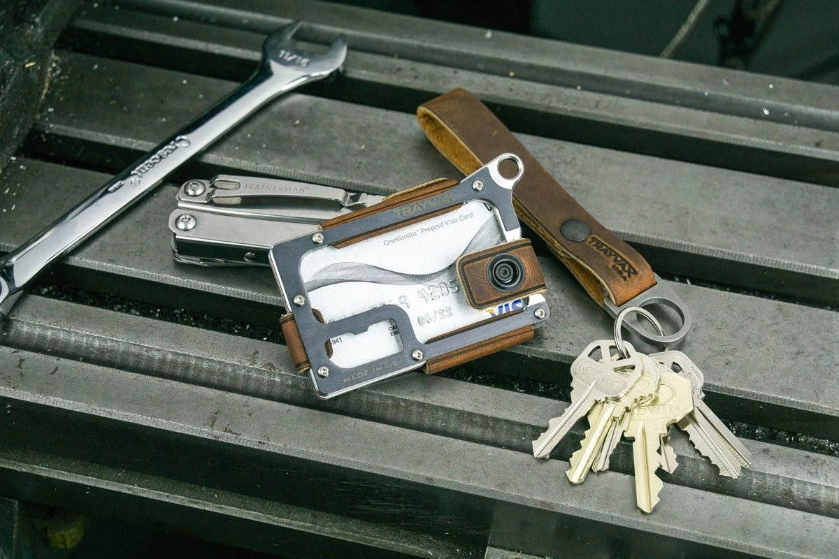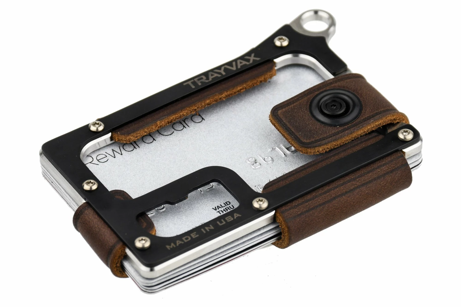 The base for this cardholder is a two-piece steel or titanium frame, which is held together by small Torx screws. Between the two parts of the frame is the locking device for the oil-tanned leather. Which as always with Trayvax is of outstanding quality and ages beautifully over time. Depending on how many cards you want to carry (13 is the maximum according to the manufacturer), the leather can be adjusted in size. Also on the front side there is a small compartment where folded banknotes can be stored.